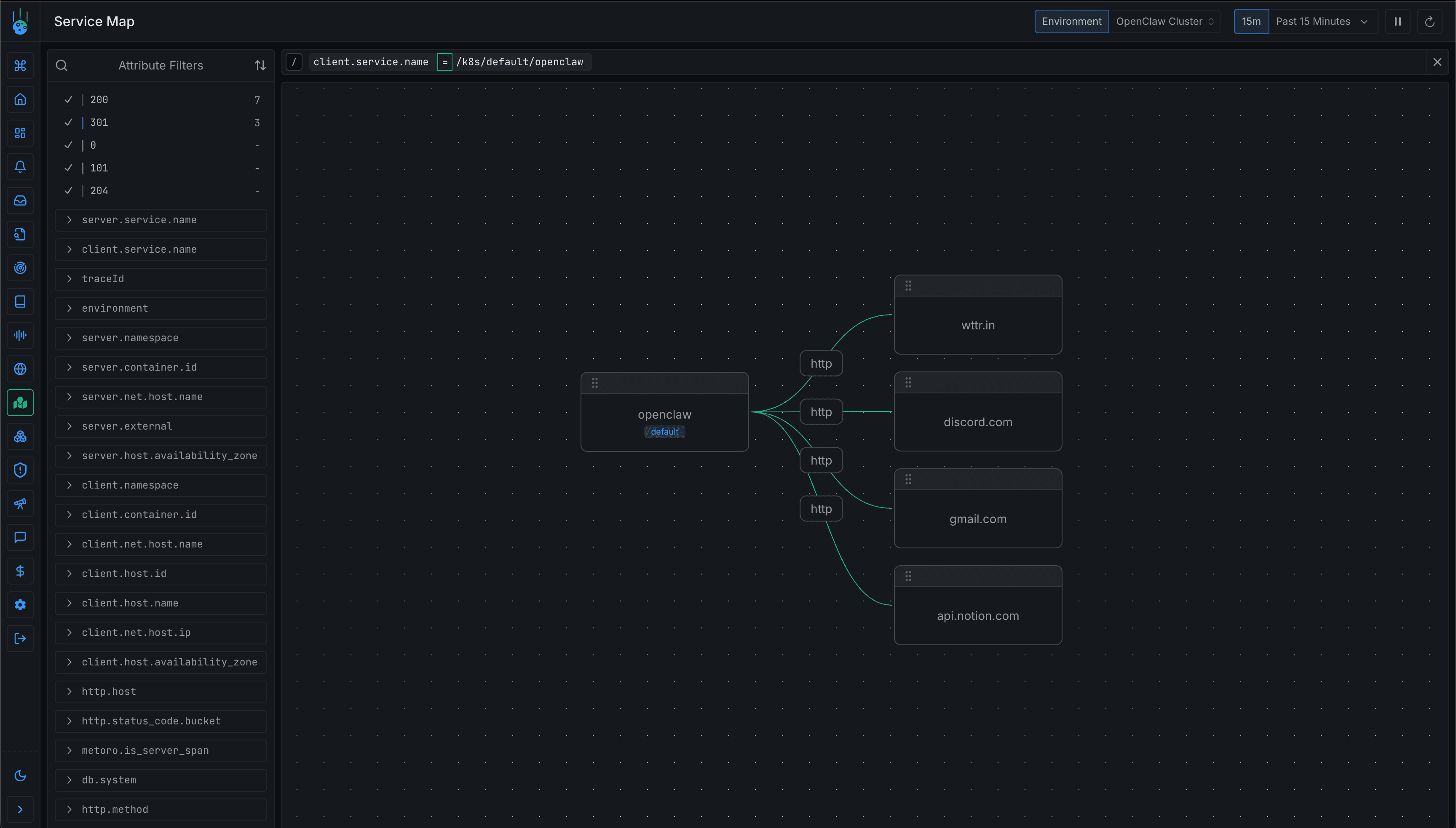 The service map shows OpenClaw reaching out to various external services. We can drill down into individual requests to see exactly what's happening.
